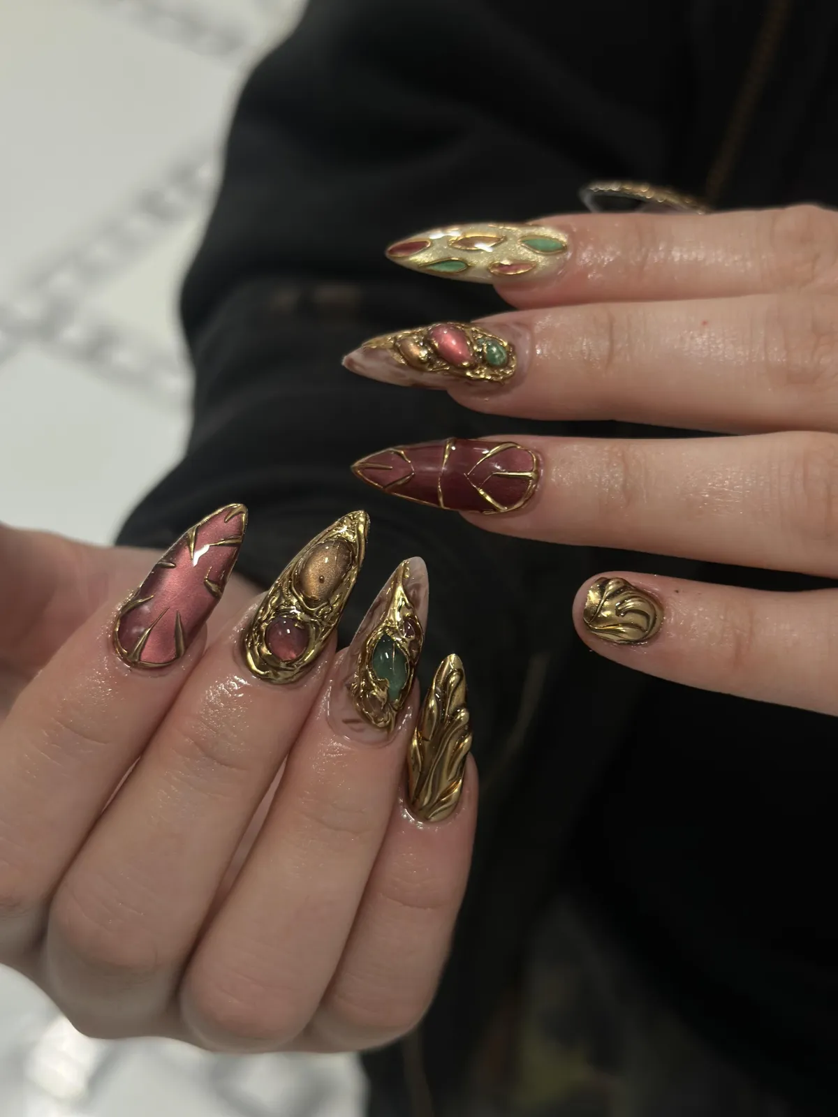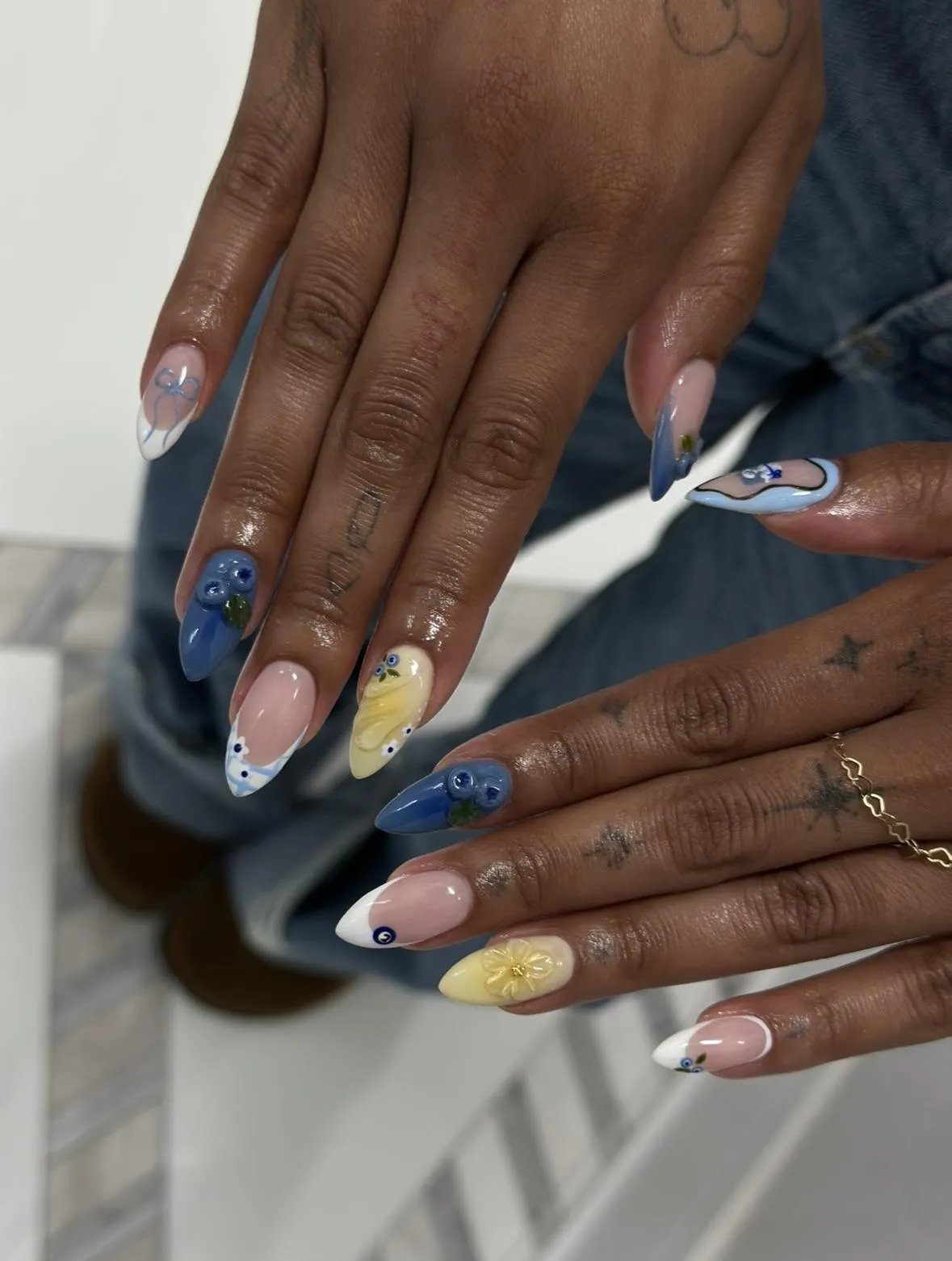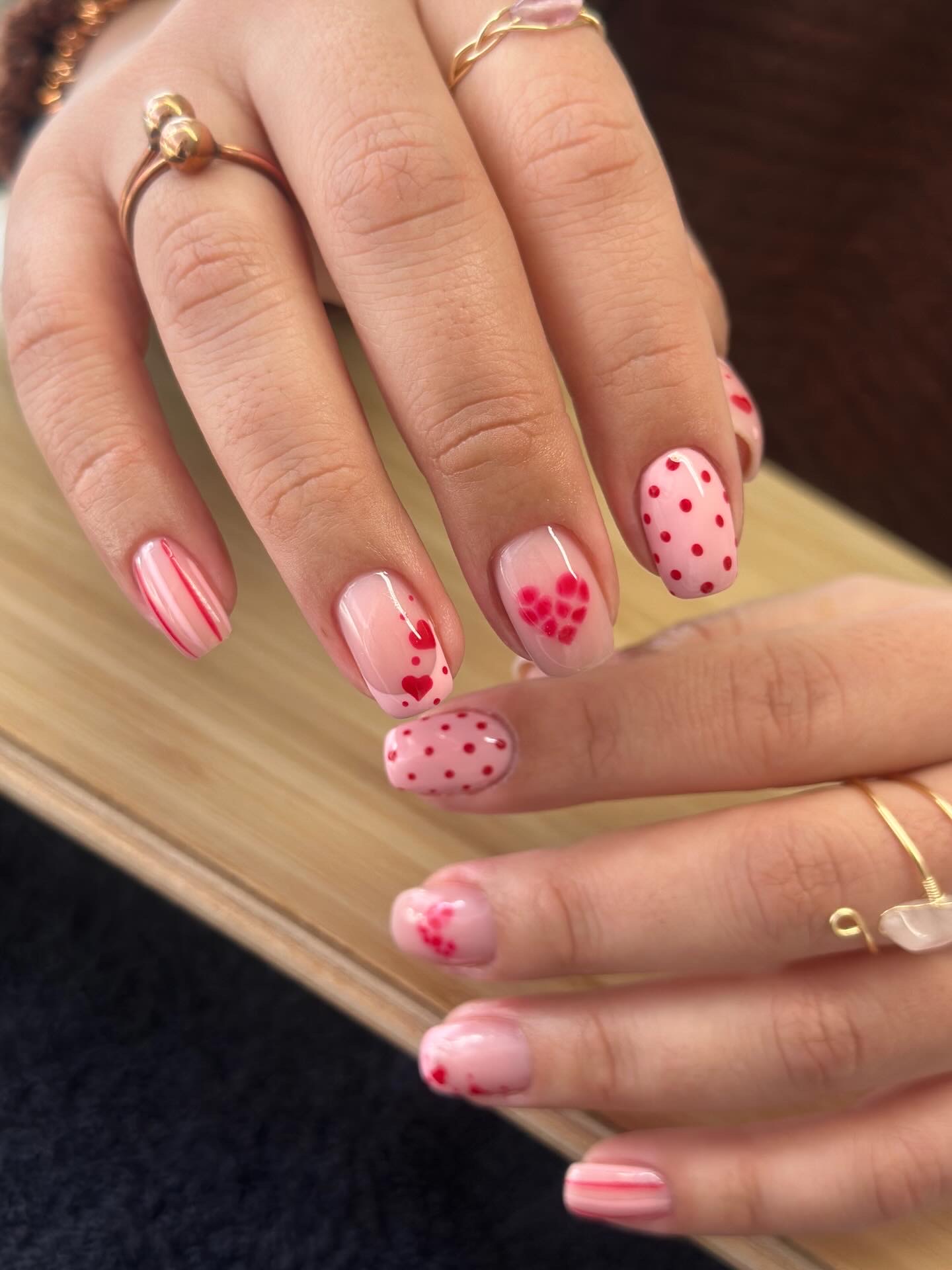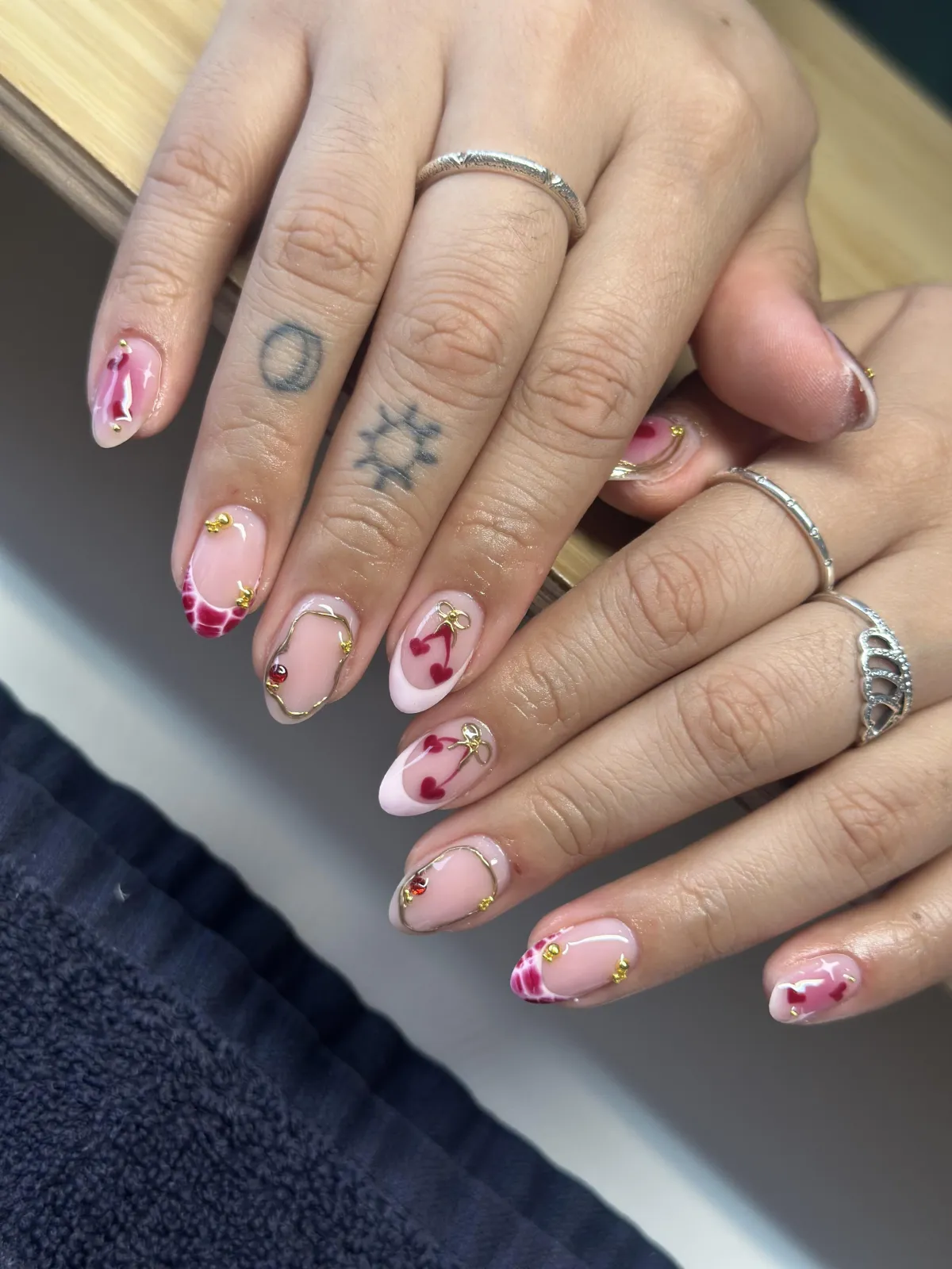Your chosen gel color and any custom nail art or design are applied.