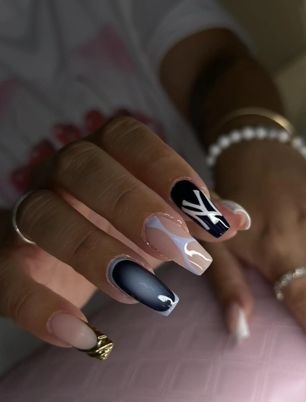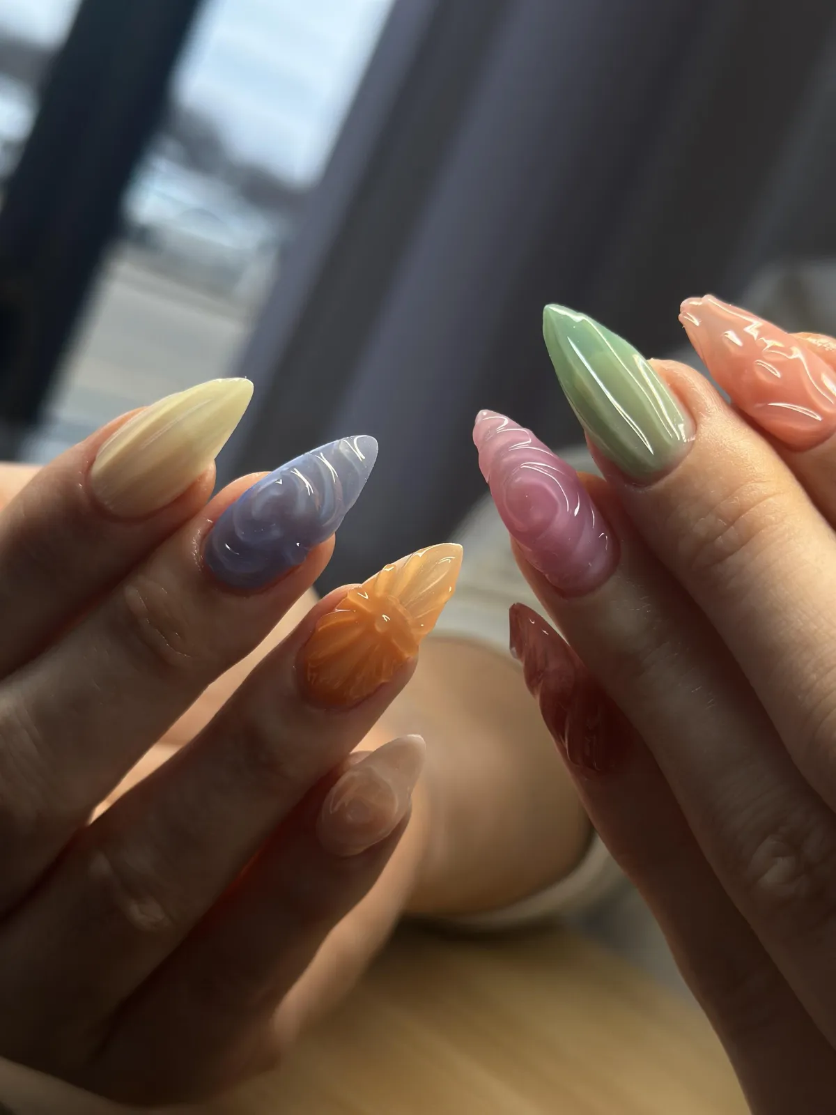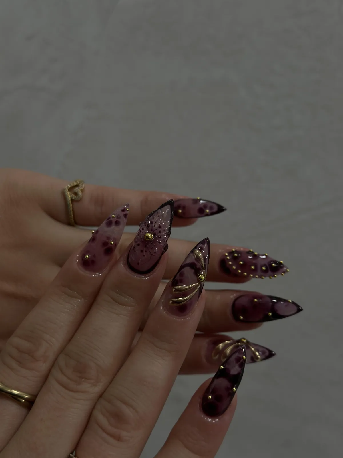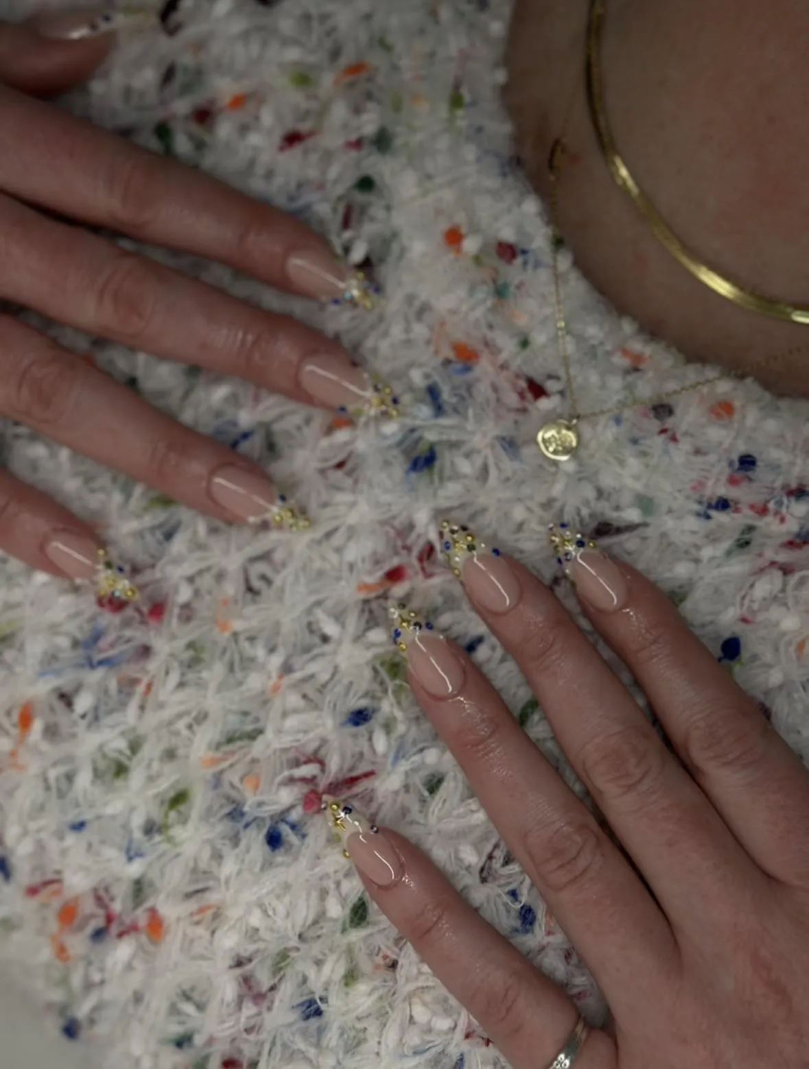 Your chosen gel color and any custom nail art or design are applied.